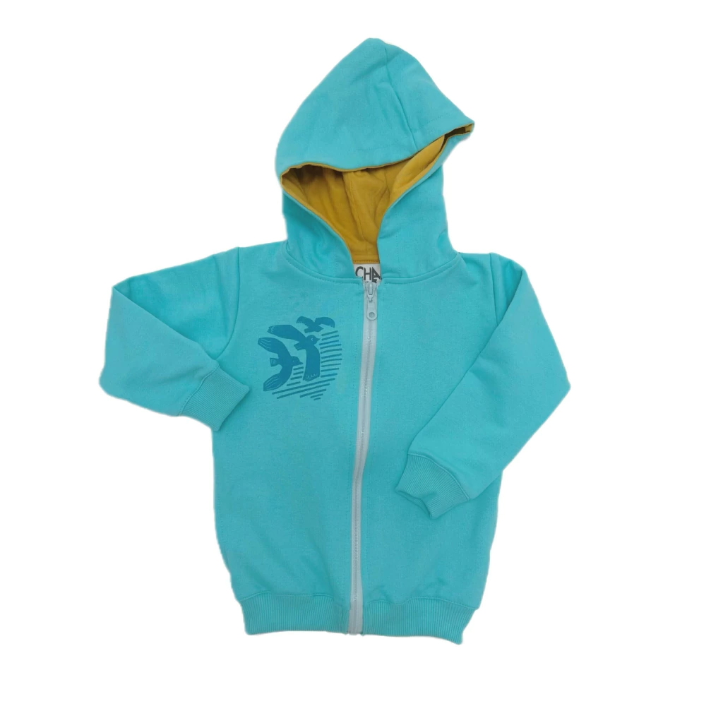La capucha es forrada en Jersey suavecito en color amarillo mostaza.